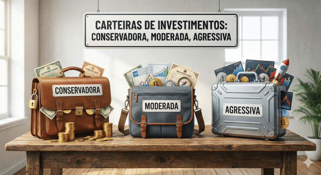 A carteira conservadora foca na preservação do capital, investindo em ativos de baixo risco, como títulos de renda fixa, fundos de renda fixa e produtos garantidos pelo FGC (Fundo Garantidor de Créditos). Já a carteira moderada busca um equilíbrio entre segurança e rentabilidade, combinando ativos de renda fixa com uma parcela significativa de renda variável, como ações e fundos imobiliários. Por fim, a carteira agressiva visa maximizar retornos, assumindo maior risco, investindo sobretudo em ações, ETFs, fundos multimercado e ativos com maior volatilidade.